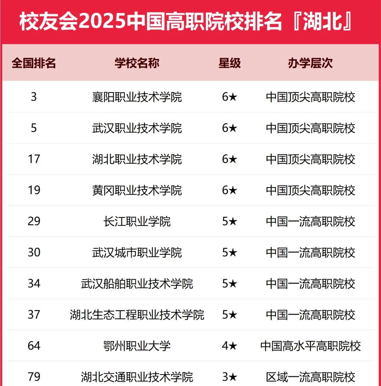 湖北最优质的10所大专:湖北职院第3,长江职院第5,鄂州职大第9