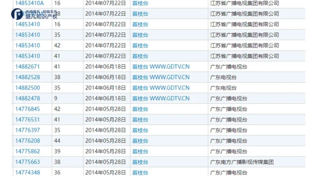 湖南广播电视台早早就对“芒果台”商标进行了布局,争夺“荔枝台”的江苏省广播电视集团有限公司与广东广播电视台也在商标注册上暗中博弈,所注册的多个商标国际分类涉及通讯服务、金融物管、广告销售等。