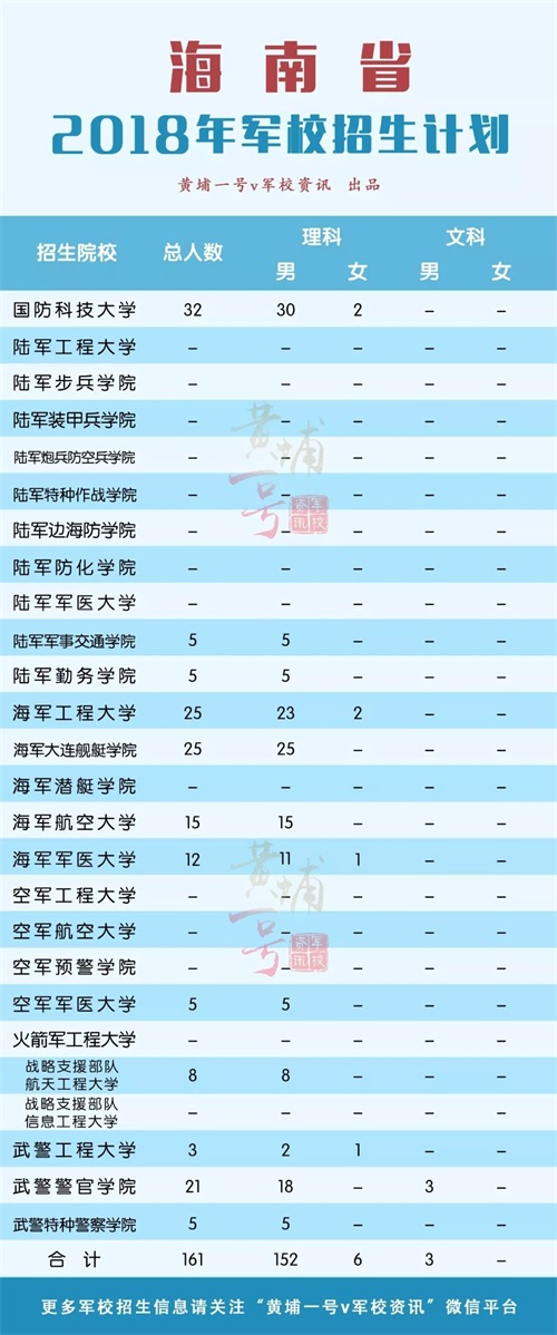 1、本次发布的“2018年解放军和武警部队院校招收普通高中毕业生计划”以省市区为单位单列,每个省市区的招生计划用一张图表呈现,区分文理科、男女生,以方便考生和家长查阅。