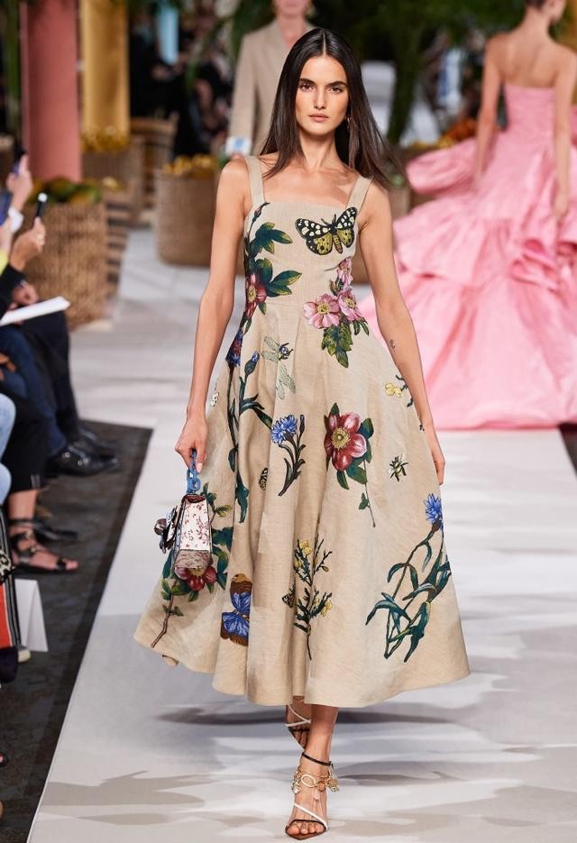 看过了帅气的西装造型,又换了复古风格的连衣裙,亚麻质地的面料高级感十足,卡其色更是把贝贝的肤色显得更白皙。这身连衣裙的亮点所在就是宽大的裙摆,在裙摆上点缀着花朵和蝴蝶的图案,在T台上款款而行的贝贝,就像是“花仙子”一样。