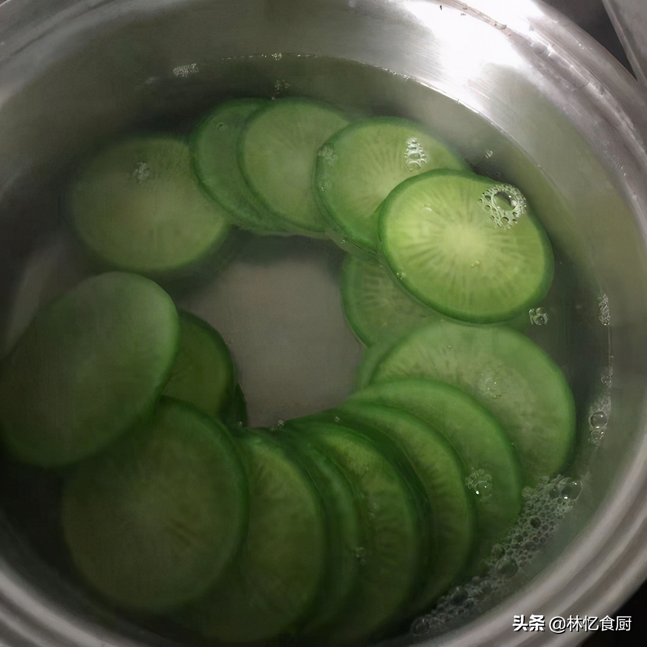1、青萝卜洗净、削皮,切成半公分厚度的薄片。锅内添水,加1勺油和少量食盐,待水烧开后,将萝卜片倒入,煮1分钟至萝卜变软。捞出控水,装盘待用。