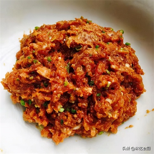 2、肉馅的调制跟我们平时调馅料是一样的,调料根据自己口味调整。料汁中淀粉比较关键,它能让料汁口感更加爽滑,不可缺少。