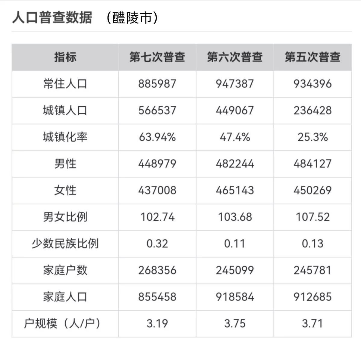 根据第七次人口普查数据,截至2020年11月1日零时,醴陵市常住人口为885987人。