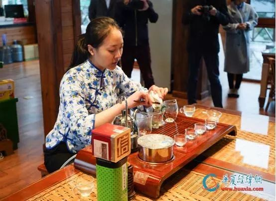 台湾记者品尝冲泡好的信阳毛尖