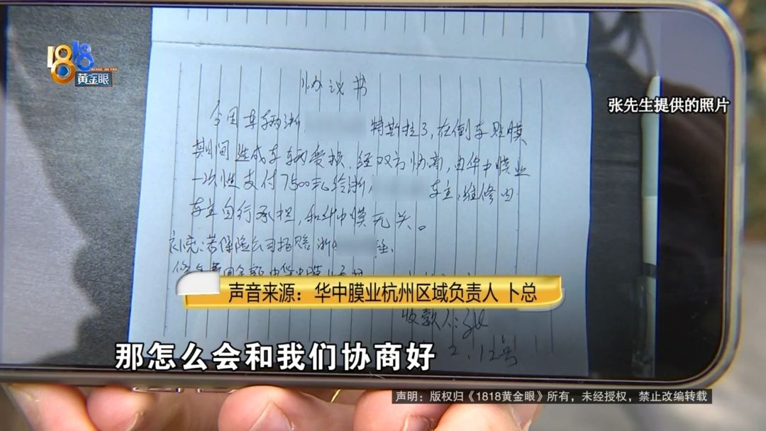 华中膜业杭州区域负责人 卜总:本来这个钱一次性付清,也不管赔偿多少钱,我们店里省得麻烦。第二天他又说不想要这个钱,想去修。公司考虑还是以顾客为主,多个三千两千都无所谓了,一定损,两万多。我就上报公司,公司说太多了,接受不了。(七千五)这个钱,他随时要都可以给他。因为他扫码转过来,公司怎么给他?公司也没有他的账号 。
