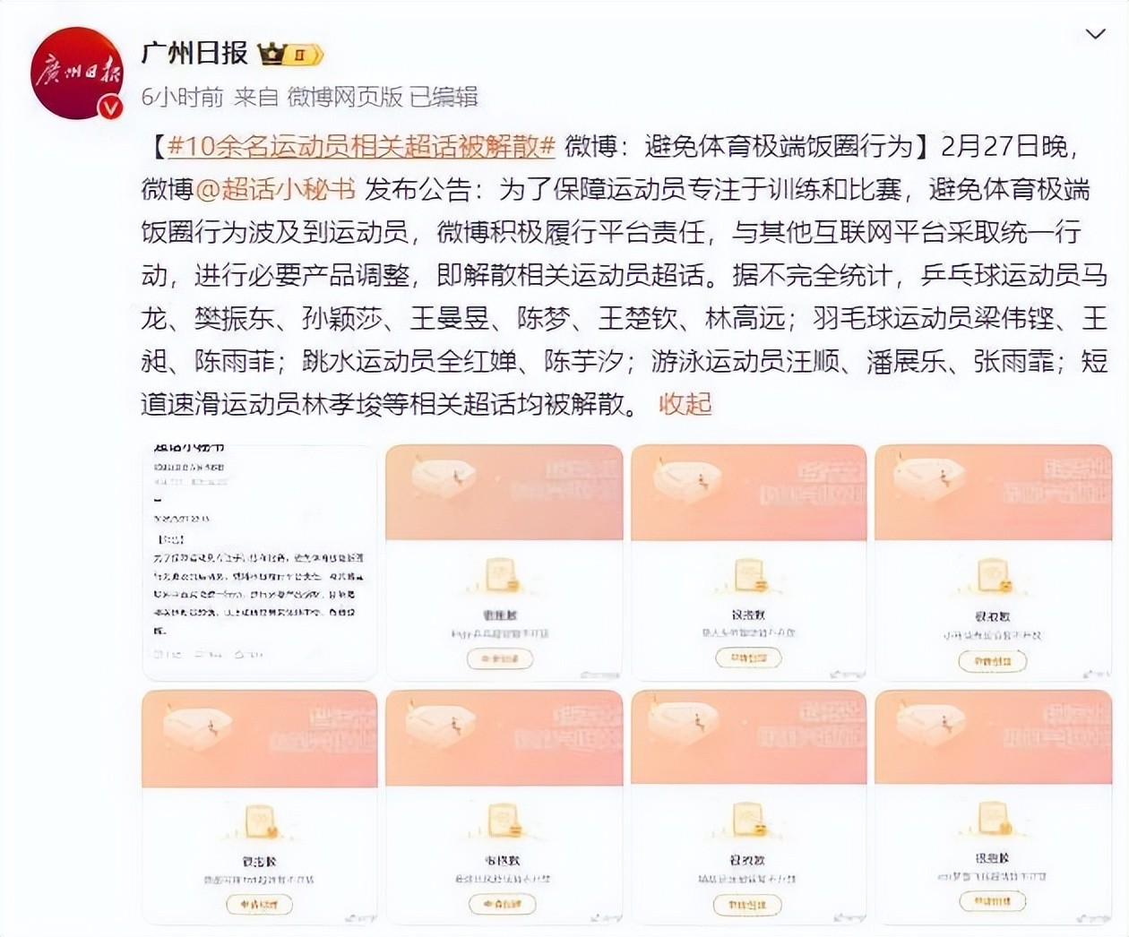 2月27日晚微博平台的一纸公告瞬间引爆了体育圈的舆论场,以孙颖莎等人为首的一个个耳熟能详的运动员名字,都出现在超话解散的名单上。