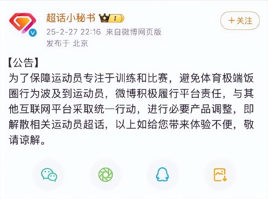 正如公告中所说,解散超话是为了保障运动员能够专注于比赛和训练,也为了避免个别极端粉丝行为干扰到运动员。