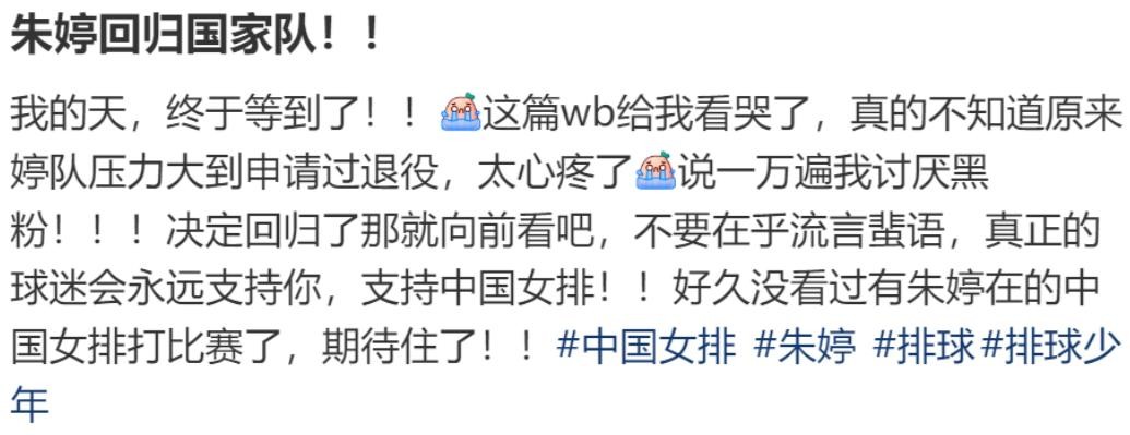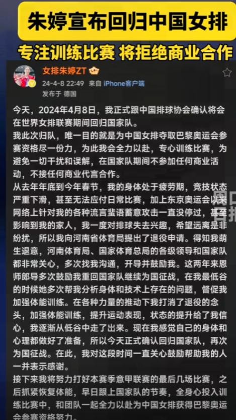 朱婷的回归,不仅展现了她对比赛的热爱和对胜利的渴望,更体现了她作为一名公众人物对粉丝和社会的责任感。