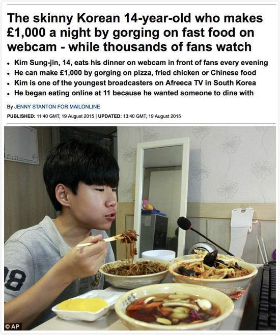 下一位哒哒君要介绍的主播就更厉害了,他甚至惊动了英国的每日邮报..这个叫做Kim Sung-jin的14岁韩国小男孩,每天晚上,他会对着网络摄像头直播自己吃晚饭的全过程,随着关注的人越来越多,现在他每天可以通过直播挣1000英镑,相当于一万人民币...你要是不信就自己看标题吧...