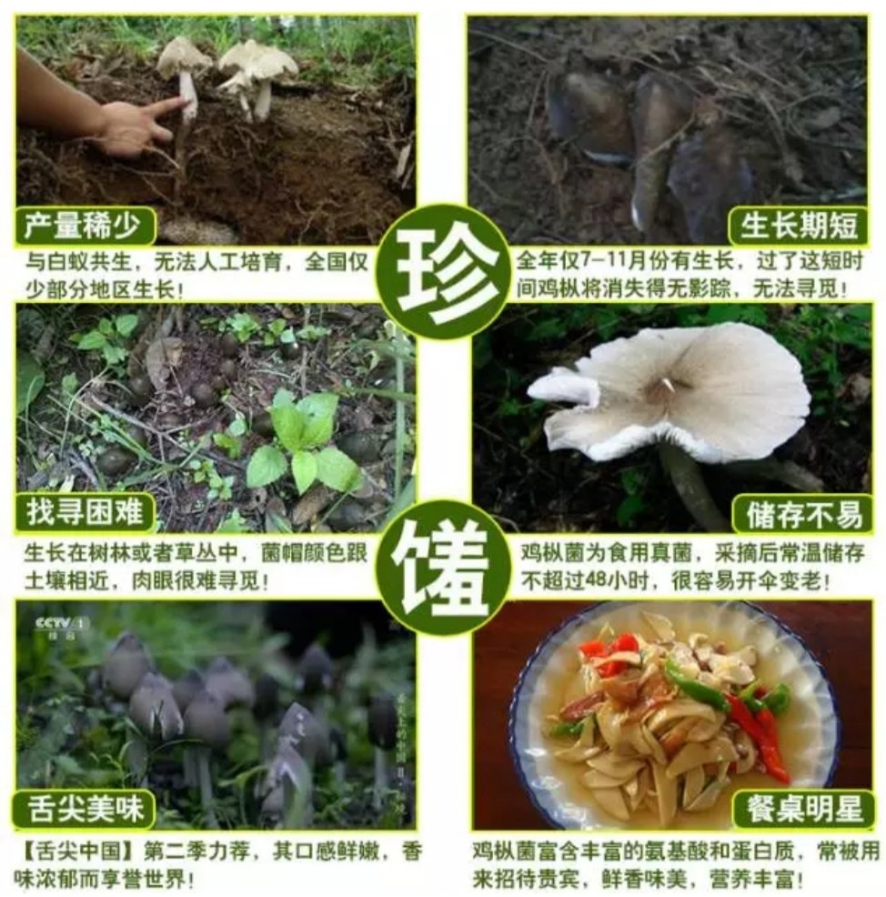 鸡枞菌肉质细嫩、鲜香甘甜,更有鸡肉般的鲜甜口感,别有一种动物性的肥美,这就是它有别于其它食用菌的缘由。鸡枞菌是中国四大名菌之一,是野生食用菌中的珍品。无论炒、炸、腌、煎、拌、烩、烤、焖、清蒸或做汤,其滋味都很鲜,被誉为“菌中之冠”。而且鸡枞的药用价值是人参的3倍,灵芝的2.5倍,冬虫夏草的1.5倍。《本草纲目》记载其“益胃健脾,养血润燥,解毒,清神”。我国已知的鸡枞有20多种,不同种的菌盖颜色不同,有灰色、黄色、白色等。菌盖上有脐突,呈蓑帽尖状或乳头状。菌盖表光滑或呈不规则龟裂。菌柄实心, 粗细不等,菌根有长短不等的假根。具有“帽尖腿长无鞋穿,脚根深处有蚁家”的特征。