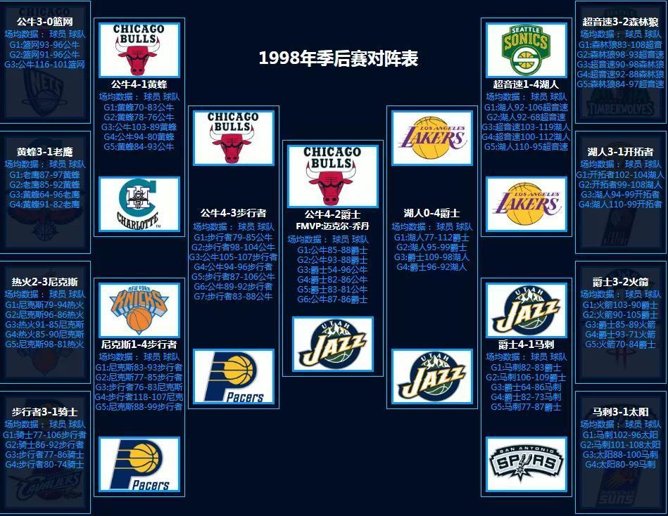 1998年季后赛,公牛队获得总冠军!FMVP是迈克尔-乔丹