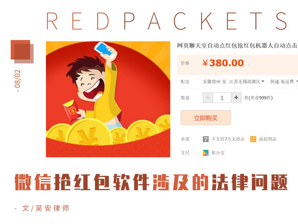 不要随大流,误以为存在就是合理。这抢红包的软件是什么?是外挂!律师本能反应的权利客体就是著作权。