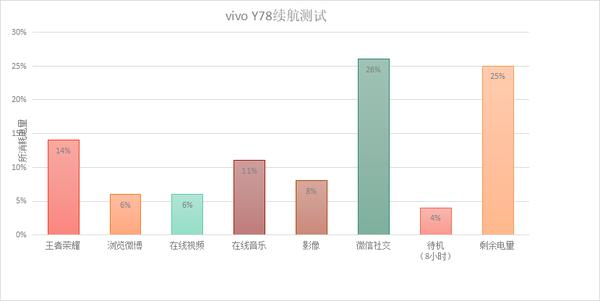 续航方面,在 5000mAh 大电池的支撑下 vivo Y78 实现一天一充不成问题。模拟耗电的方式就包括大家平时最常使用的微信、短视频平台、微博、音乐、游戏、影像等几个场景,且在 WiFi 环境、关闭蓝牙与定位、声音亮度均为 50% 的设定下进行视频、游戏、音乐各 1 小时以及待机 8 小时的续航测试。通过模拟大部分用户一天的使用场景之后 vivo Y78 剩余电量为 25%。