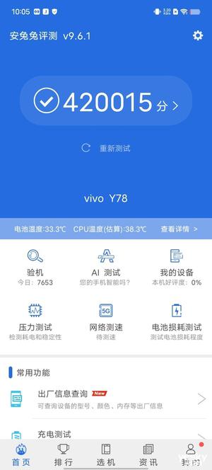 性能上 vivo Y78 搭载 6nm 制程工艺天玑 7020 芯片,对比上代功耗更低性能更强,综合性能较上代提升 14%,安兔兔跑分也有超 42 万分的成绩,日常使用稳定且流畅。最高 12GB+256GB 大内存,搭配内存融合 3.0 技术,将 ROM 空间转化为 RAM 使用,视频、照片存储无压力,应用多开丝滑顺畅。