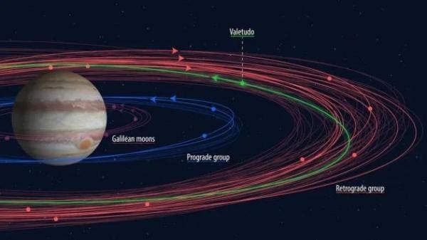 这张图显示了已确认的79颗木星卫星的轨道,顺行的卫星轨道(紫色和蓝色)较为靠近木星,而逆行的卫星轨道(红色)则较为远离木星。新发现的卫星可能属于后一类。绿色的是卫星Valetudo的轨道。它是个特例,尽管和一群逆行卫星混在一起,但却是顺行的。