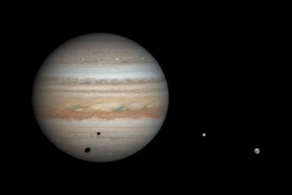 图为木卫三(最大的伽利略卫星)和木卫二(最小的伽利略卫星)以及它们在木星表面投下的影子,新发现的天体在离木星更远的轨道上