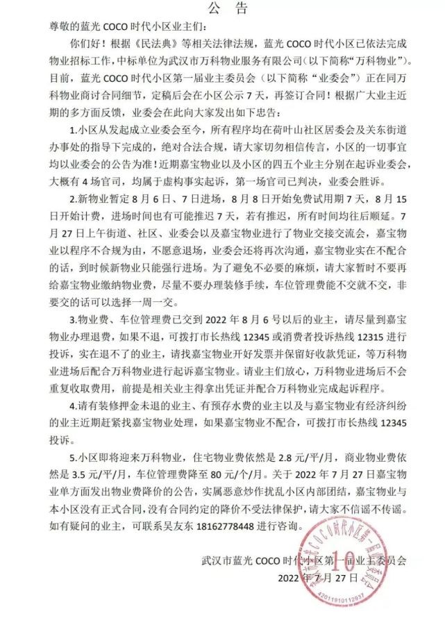 2022年7月,蓝光Coco时代小区已依法完成物业招标工作,中标单位为武汉市万科物业服务有限公司。