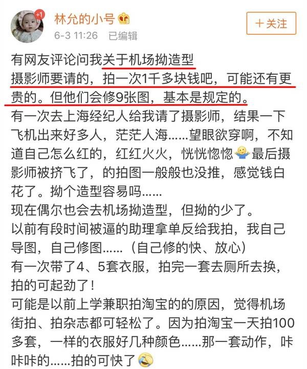 说自己的机场照都是请摄影师来拍的,拍一次1千多块,还心疼有次因为接机粉丝多没拍好机场照,钱打了水漂。
