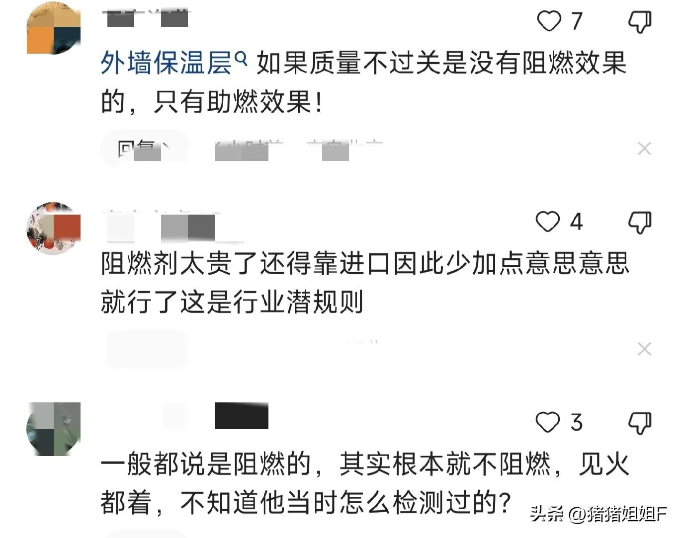 这场大火下来,真的是损失惨重。我们平时一定要注意用火的安全,还有就是在购买一些材料,比如外墙保温材料,用电:的材料开关、灯等,千万不能图便宜,便宜的很多都是不合格的产品。这些材料都是存在我们生活中的,平时也要注意检查一下。