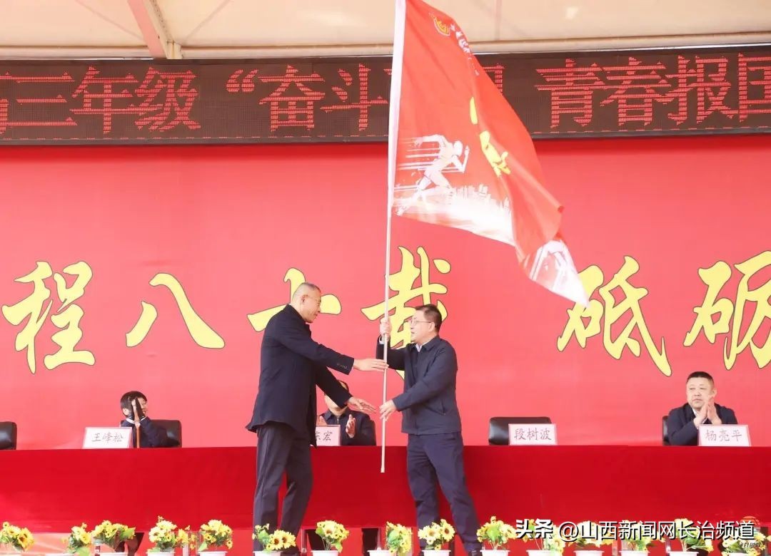 “高考必胜!”段树波为高三年级授冲锋旗,这面旗帜象征着希望与使命,激励学子们在高考的战场上奋勇拼搏。