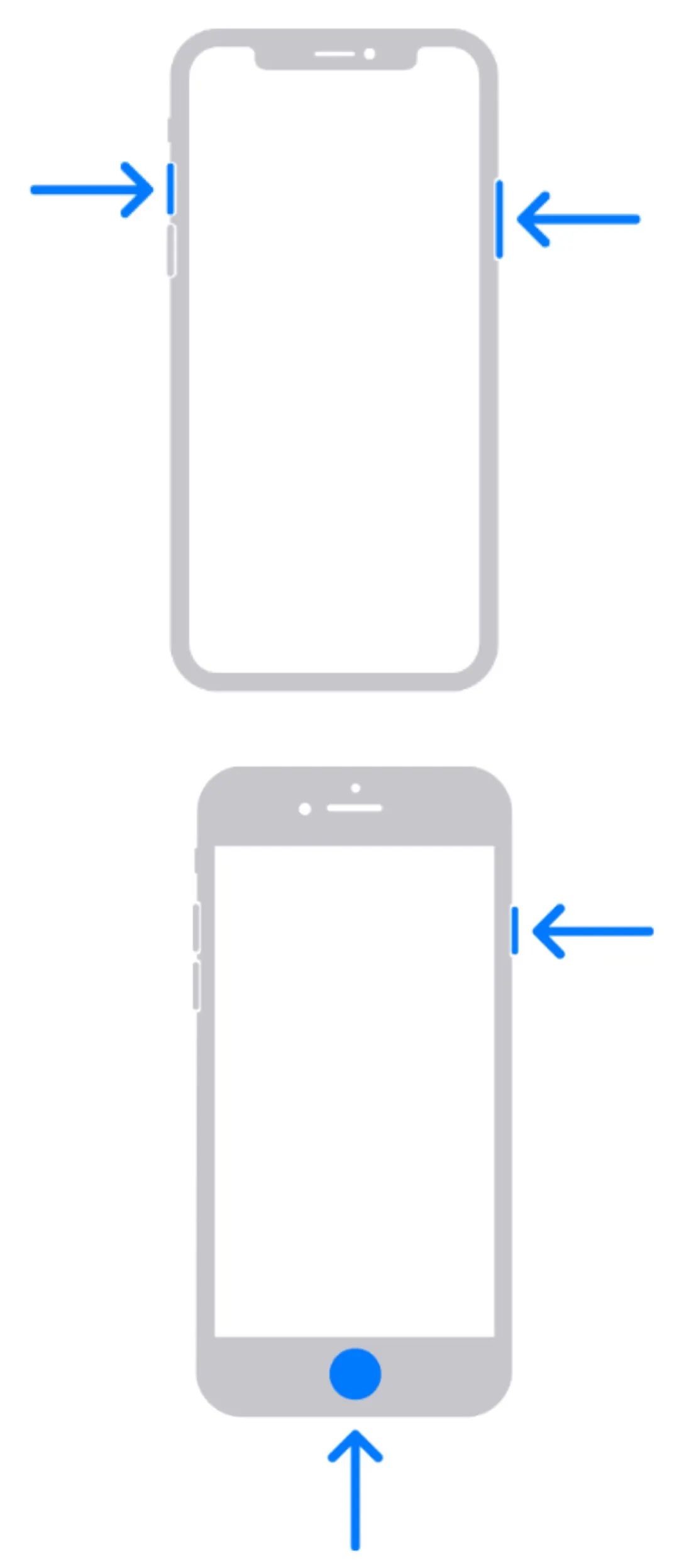 第二种情况,如果有主屏幕按钮的,可以同时按下主屏幕按钮和侧边按钮或者睡眠/唤醒按钮,然后松开。