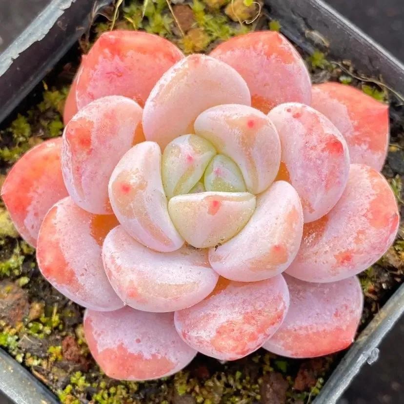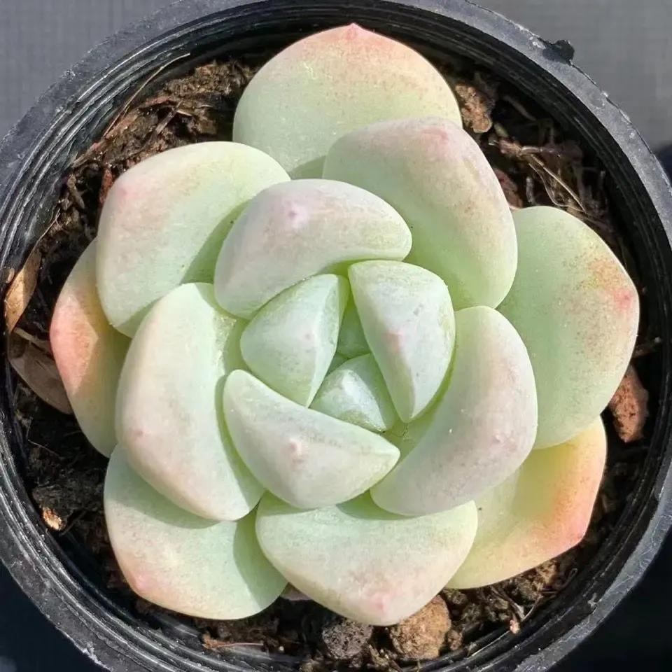 冰玉属于雪莲与厚叶月影的杂交品种,它的叶片肥厚多姿多呈现倒卵形,叶背呈三角状凸起,龙脊线较为明显,披有一层厚厚的白霜。平常状态下叶色多为白绿,一旦长出状态就会变成橙红,通透感特别强,整体具有较高的观赏价值。