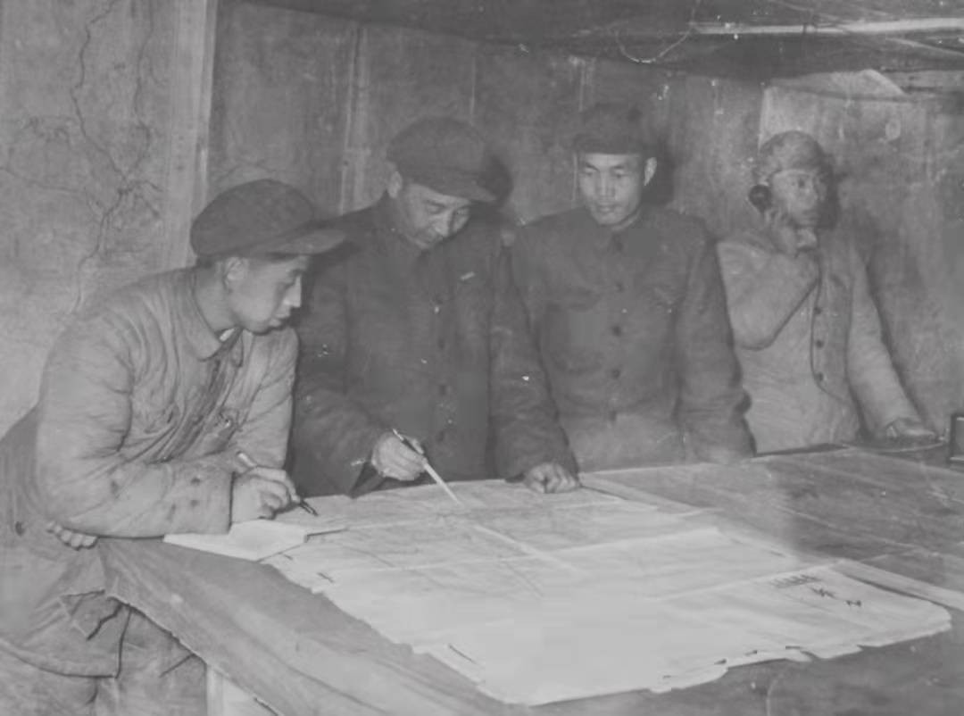 上甘岭战役期间,15军军长秦基伟(左二)研究作战计划