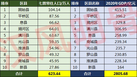 固始县常住人口为104.14万人,与第六次人口普查相比增加1.75人,是信阳市常住人口最多的区县。固始县总面积2946平方千米,2020年GDP总量达到415.51亿元,也是信阳市土地面积最大、经济实力最强的区县。值得注意的是,固始县的户籍人口高达179.16万人,这意味着固始县的流出人口超过75万人,从侧面也能反映出固始县经济发展极为不理想的现状。