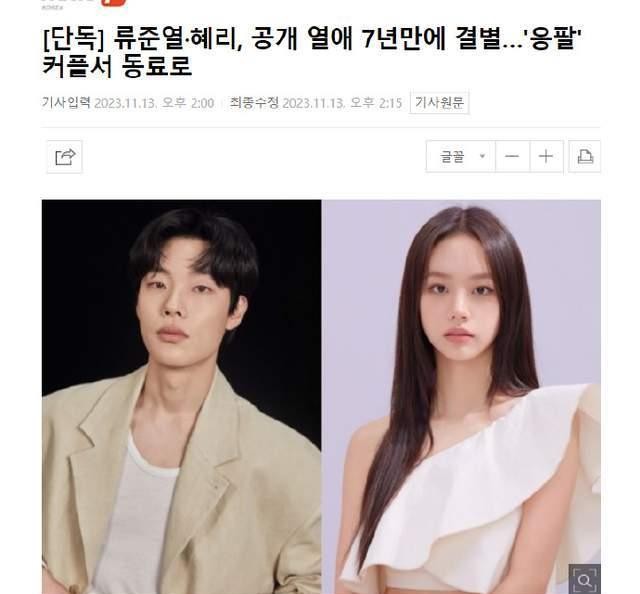柳俊烈和李惠利宣布分手! “高善”7年恋情结束