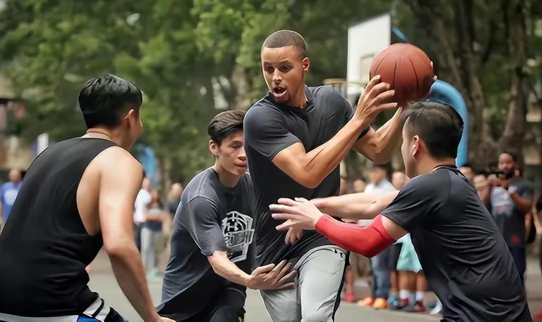 这一张照片展示了一位普通人在三名防守球员的包夹下试图投篮得分的一刻。明显可见,防守球员的身体接触和臂展缩小了普通人的出手空间,使得得分变得异常困难。在NBA,每个篮球进攻都需要克服对手防守的围堵,对于普通人而言,这是一个几乎无法企及的高度。