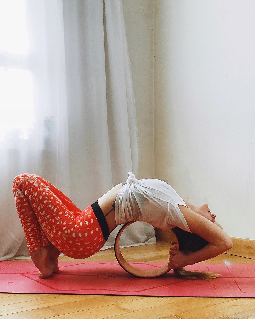 体式要点:借助下辅助轮来完成这个动作会更加轻松。首先蹲式进入,接着在背后放置一个辅助轮,将身体慢慢向后下弯,背部依靠在辅助轮上,双臂屈肘,双手抓住辅助轮两端以固定住。