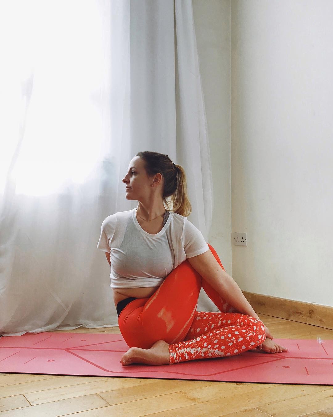 体式要点:坐在垫子上,背部伸直,左腿屈膝小腿向内折回,右腿屈膝抬起,绕过左大腿根部,来到左腿外侧,上半身同时向右侧扭转,右手臂向背后延伸,左手臂搭在右腿上。