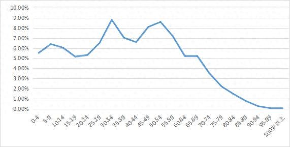 从数据及曲线图可以看出,30-34岁的人数最多,达到了12414万人,占比8.81%。
