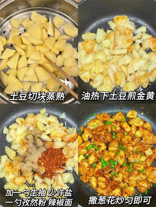 然后,撒上一把辣椒粉、孜然粉,再撒点盐,翻炒均匀。哇,那味道,辣得过瘾,香得流口水!吃一口,土豆的外皮酥脆,里面软糯,辣椒和孜然的香味儿在嘴里爆炸,简直太好吃了!我每次做这道菜,都能吃上一大盘,停不下来!
