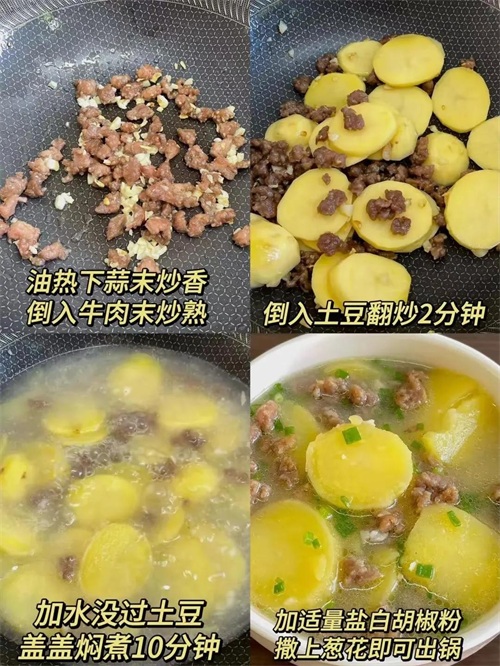 然后,加水烧开,把土豆块扔进去,一起煮。煮到土豆软烂,汤也变得浓稠,那鲜味儿就飘出来了,简直能鲜掉眉毛!撒点葱花、香菜,哇,那味道,鲜得眉毛都快掉下来了!喝一口汤,吃一口土豆,再吃点牛肉沫,简直美味极了!这道汤,我每次都能喝上两大碗,暖身又暖心!
