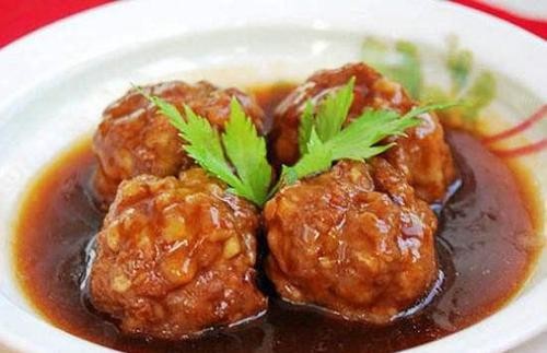 9.最后捞出丸子,用1汤匙淀粉加1汤匙的清水,勾芡淋在丸子表面即可