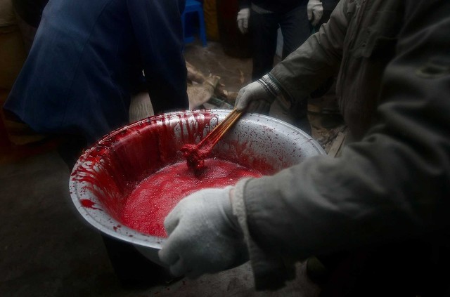 首先将买来的动物内脏先切成小块状,再将这些内脏用绞肉机,或者是用刀剁碎,经量把肝脏剁成肉泥状。然后用一个容器,将剁好的肝脏肉泥装起来,再将动物的血加入进去,然后一起搅拌均匀,等到血凝固以后就可以使用了。
