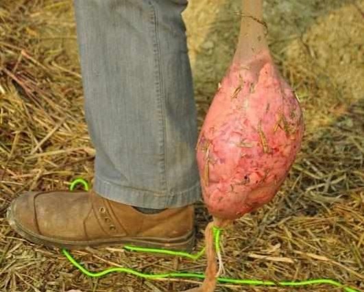 一切准备就绪以后,此时就要拿出“主角”丝袜了。丝袜不必过长,长度约在15厘米为宜,将窝料装入丝袜内,在将丝袜口用扎带扎紧,以免窝料洒落出来。装有窝料的丝袜,等到了钓点就可以直接抛入窝中了。
