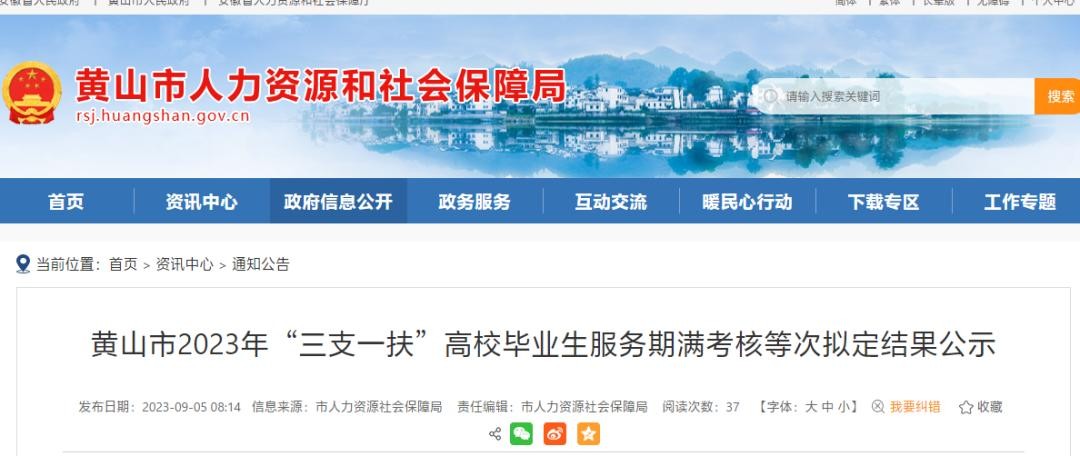 9月5日,黄山市人力资源和社会保障局发布《黄山市2023年“三支一扶”高校毕业生服务期满考核等次拟定结果公示》,公示详情如下: