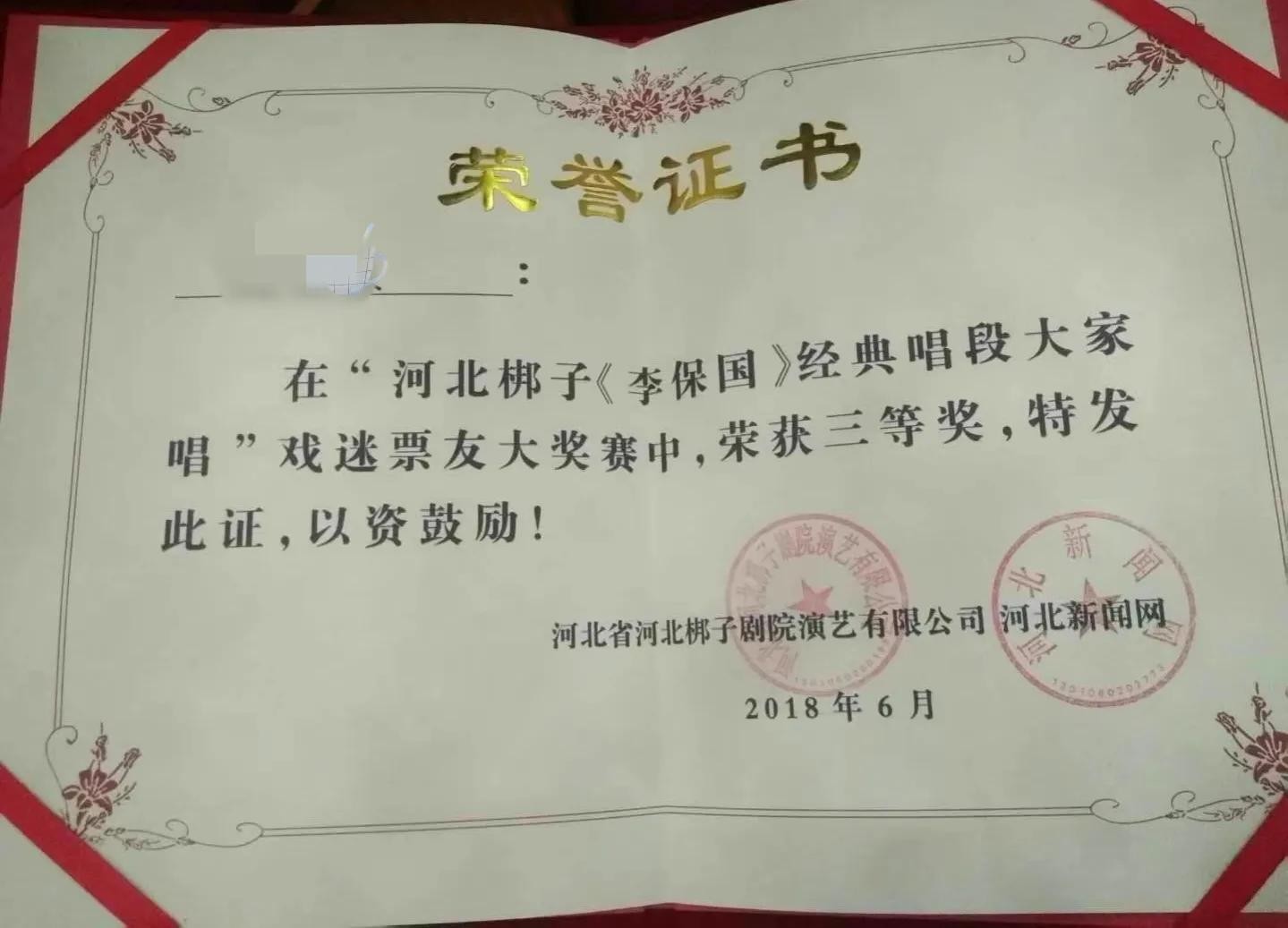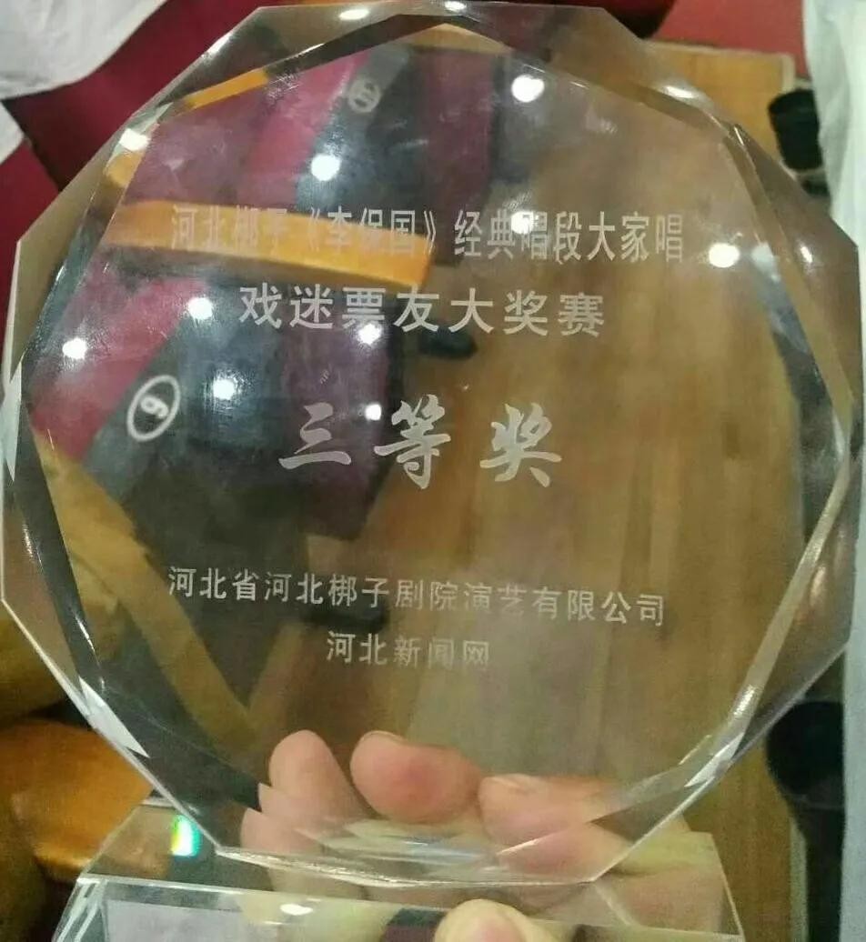 为了扩大宣传,鼓励一些票友参加了《李保国》的一段唱腔比赛活动,我有幸参加了比赛,荣获了三等奖的一个成绩。还奖励了500块。结束后拍照留念。