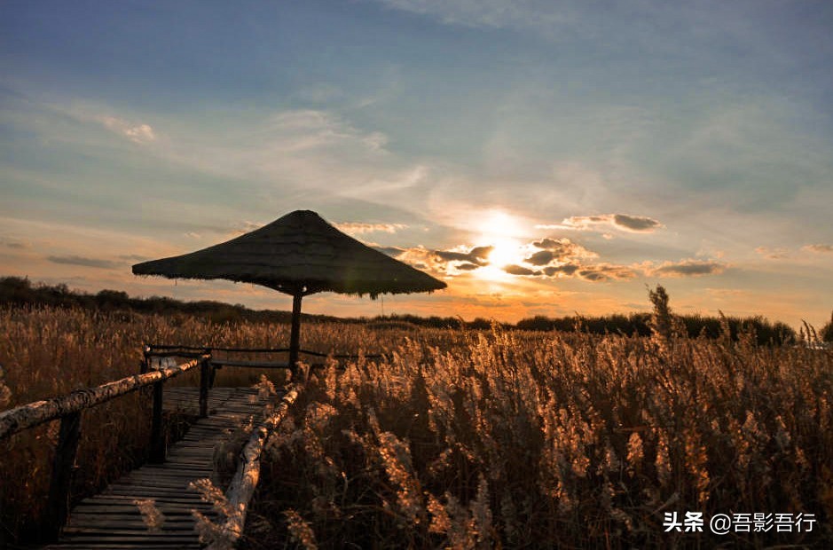 当停车场时,太阳西下了。我们就赶紧沿着芦苇荡中的一条木筏路跑去了湖边。