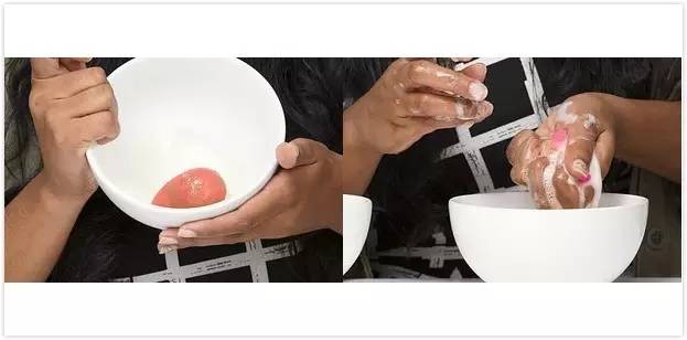 如何清理:同理将沐浴液倒在浸湿的美妆蛋上,这时需要使劲用手搓揉挤捏,才能挤出残余的化妆品,最后用流动的清水洗净,全程大约需五分钟。