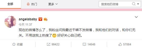 7月17日,针对自己深夜发微一事,angelababy做出了回应,她表示粉丝问我最近干嘛不发微博,这是我和粉丝的对话,和你们无关。