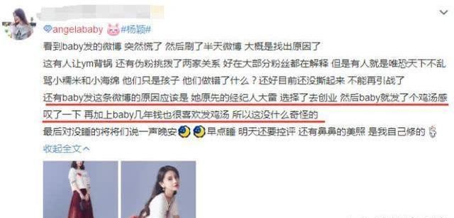 甚至有网友发现baby在更新完博文后,关注人数从755变成了754,取关了一个人,但有网友看了baby关注的人中并未取关杨幂,而粉丝也曝光了baby发鸡汤文的真相。