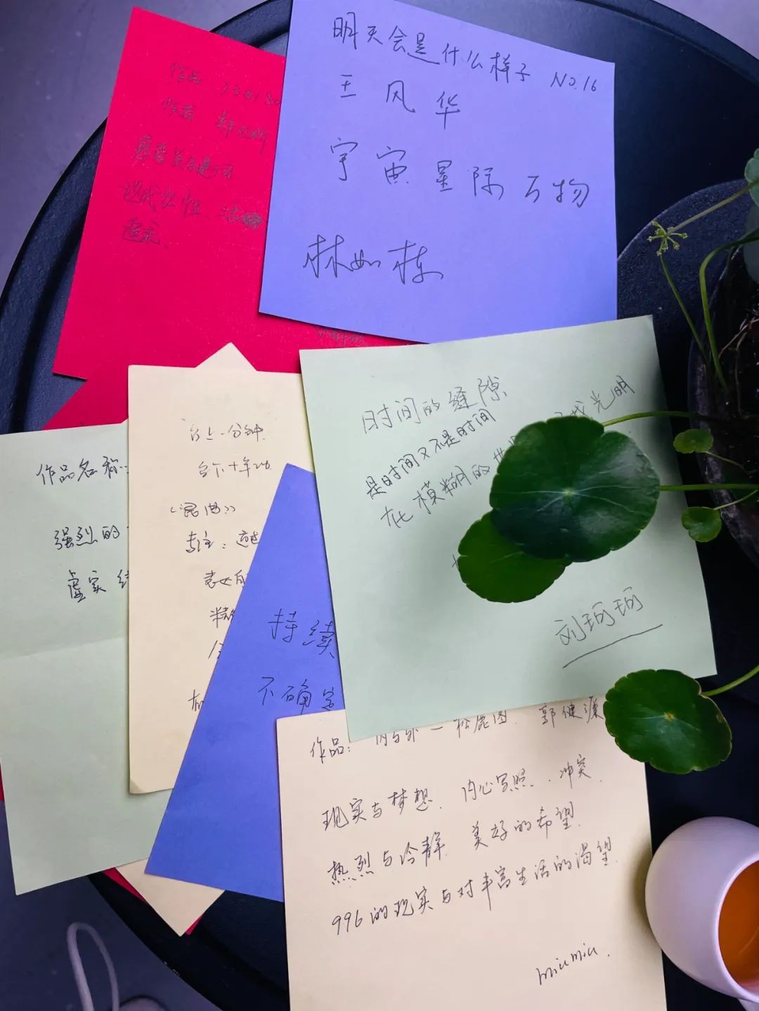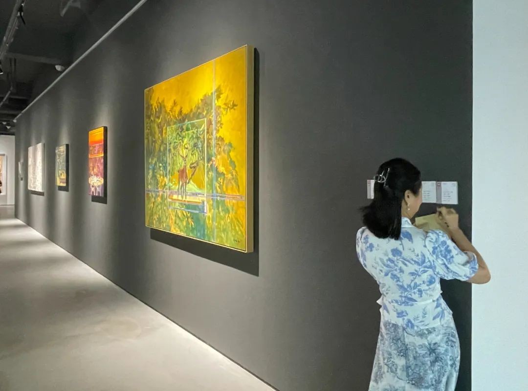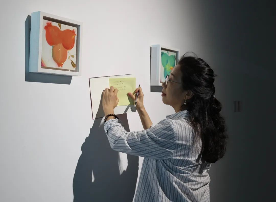 在艺术鉴赏环节,各位嘉宾在展厅里现场寻找自己最有感触的作品,以关键词的形式,把自己的评价写在色卡上,再轮流进行深入的阐释和分享。通过发言和互动,嘉宾们的观点、视角和细致入微的感受被激发出来,自由地挖掘色彩和造型背后的美、诗意和思想。
