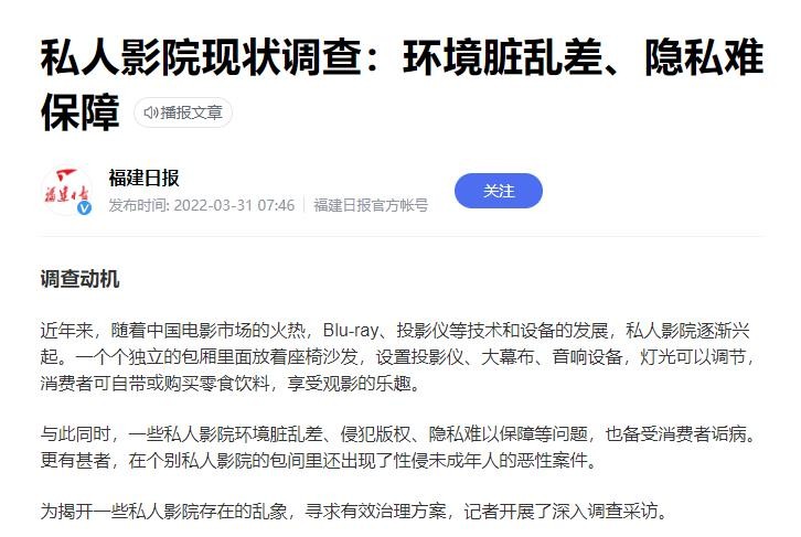 据法治日报、杭州网、九派、福建日报、红星、安徽卫视,现在有的地方有一些私人影院,媒体认为他们隐私难以确保,环境脏乱差。