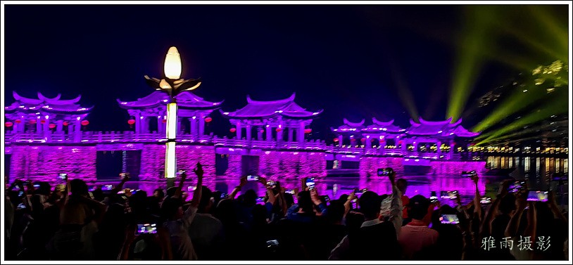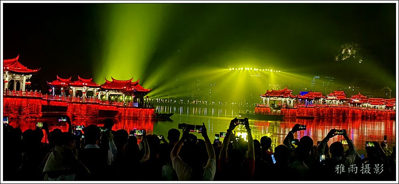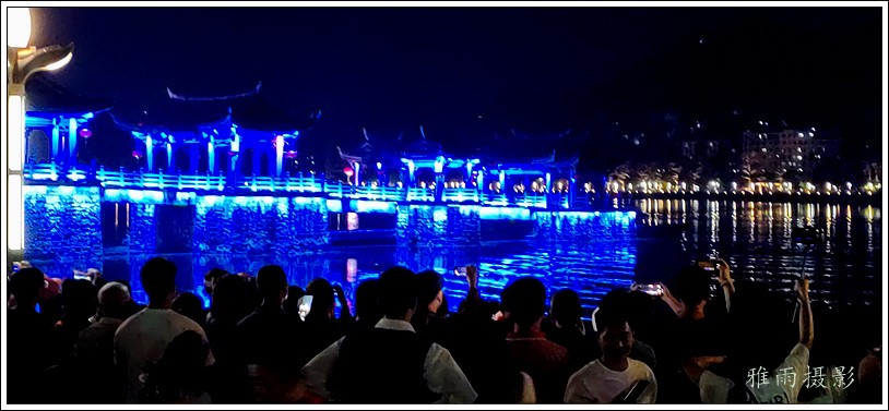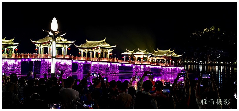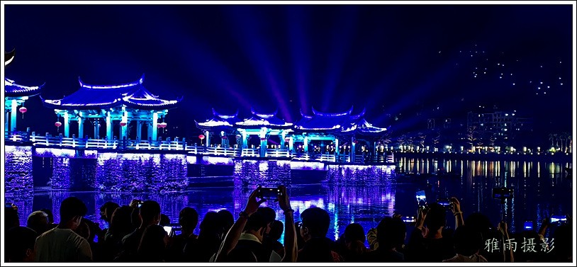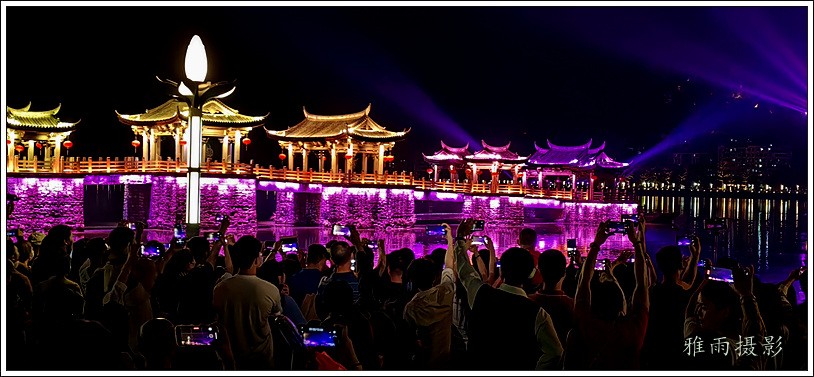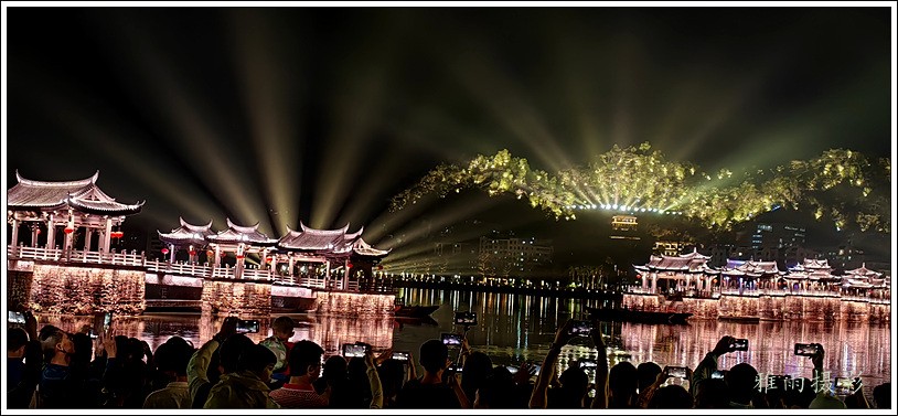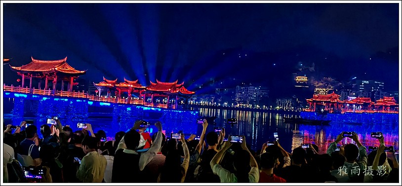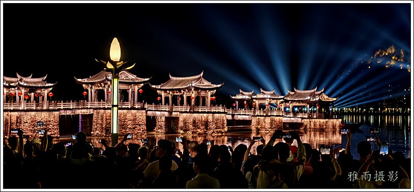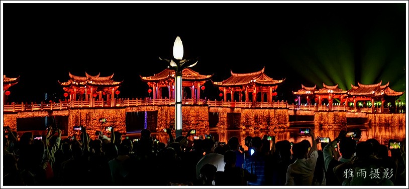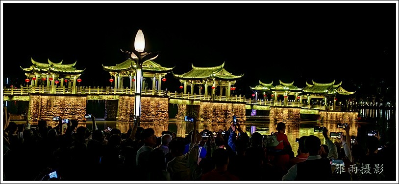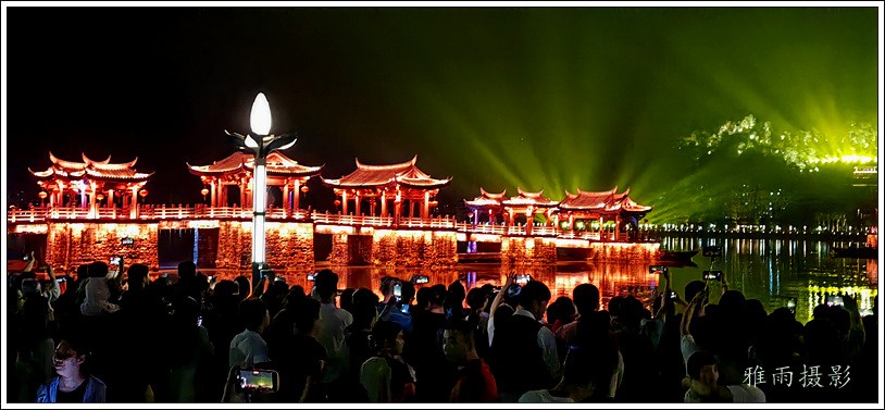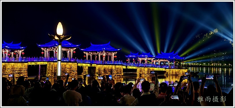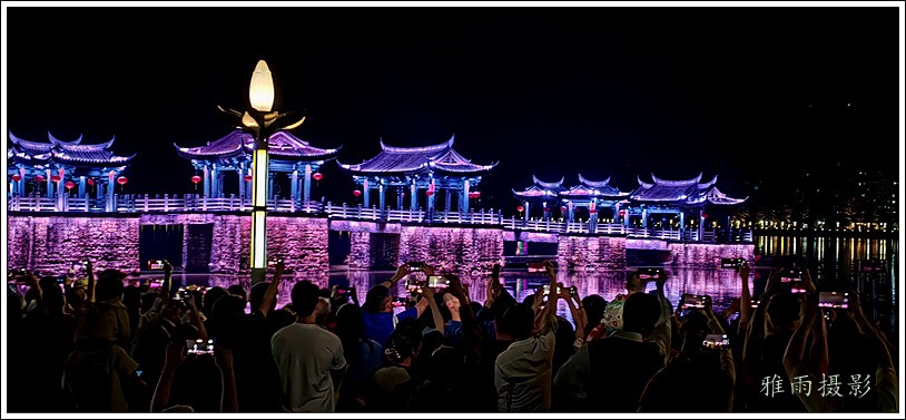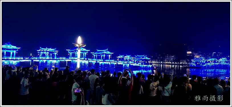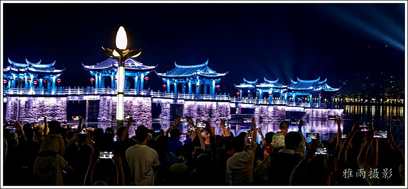 潮州之行的重要收获是广济桥灯光秀。从酒店服务员那里得知晚上8点有一场广济桥灯光秀,便抓紧时间品尝了向往已久的潮州美食,然后步行通过广济门来到韩江江畔。只见江边早已人山人海,难以下脚。经过反复对比测量,总是找到一处较高位置,可以总揽广济桥灯光秀全景,现场感受到这场反映潮州历史和现代文化的灯光图景。