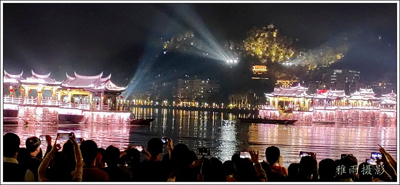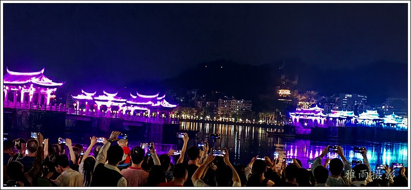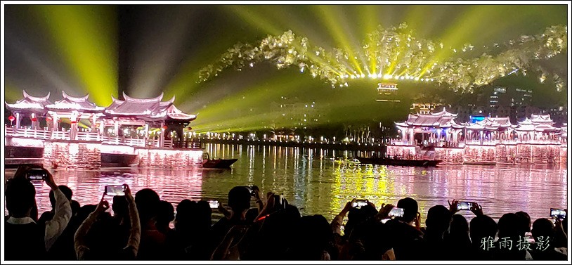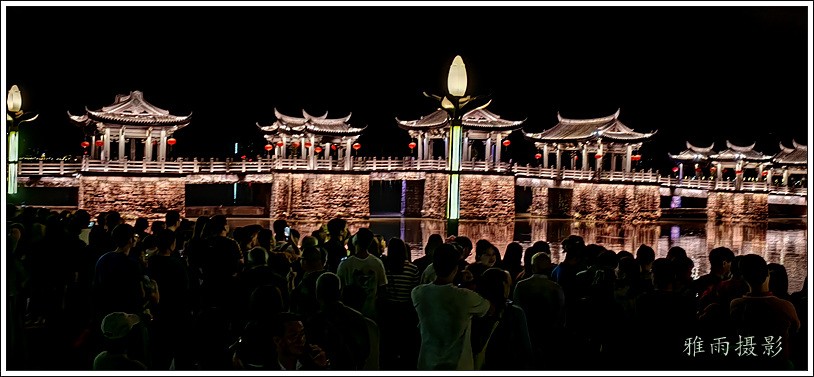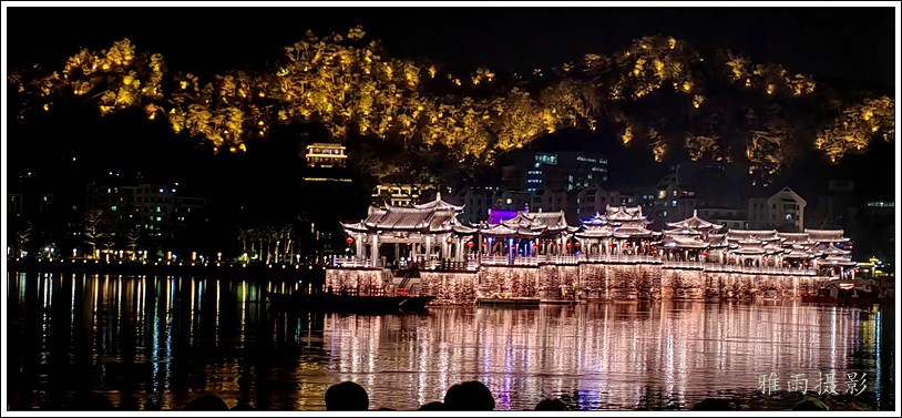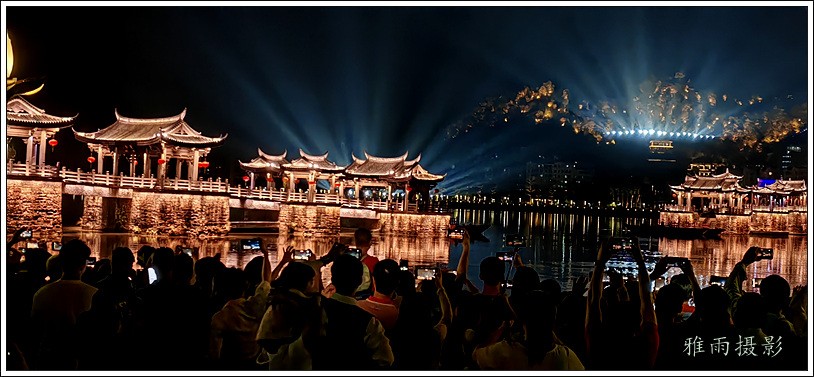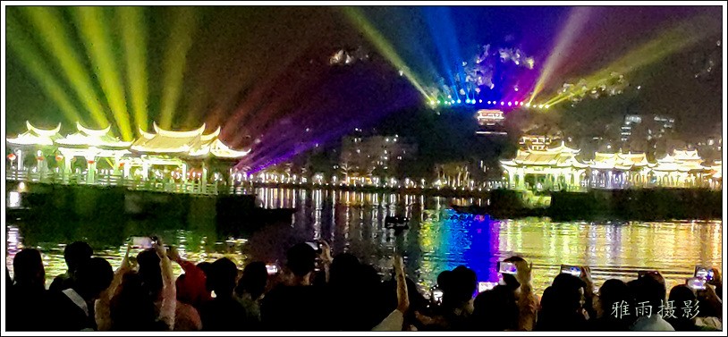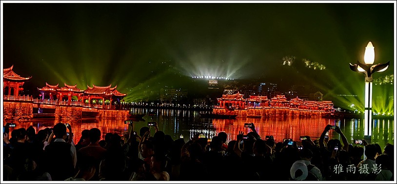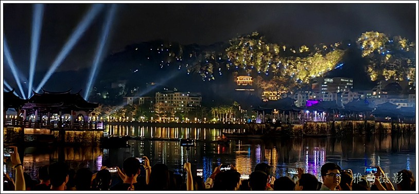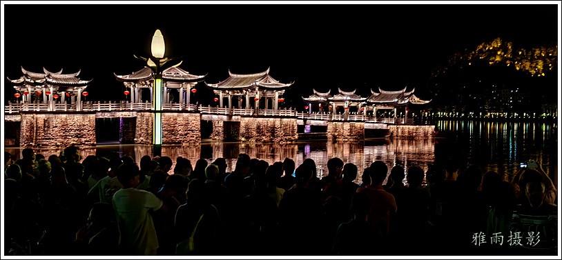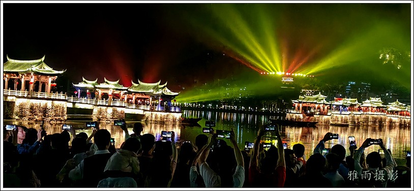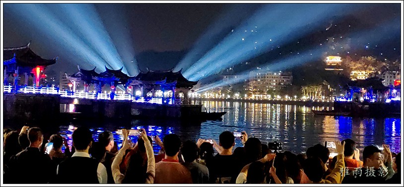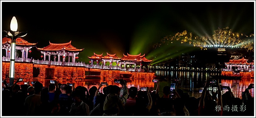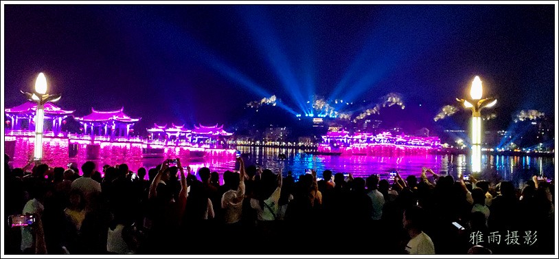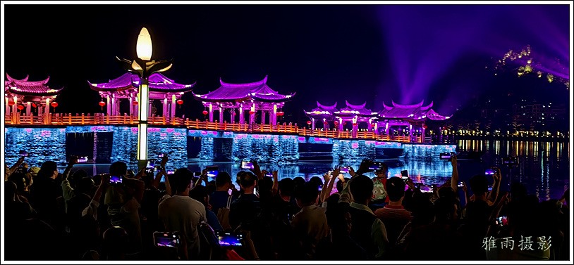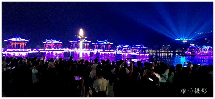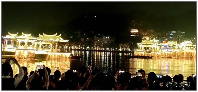 潮州之行的重要收获是广济桥灯光秀。从酒店服务员那里得知晚上8点有一场广济桥灯光秀,便抓紧时间品尝了向往已久的潮州美食,然后步行通过广济门来到韩江江畔。只见江边早已人山人海,难以下脚。经过反复对比测量,总是找到一处较高位置,可以总揽广济桥灯光秀全景,现场感受到这场反映潮州历史和现代文化的灯光图景。