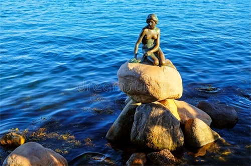 市区里最著名要算 “美人鱼”(Little Mermaid)雕像了,她是哥本哈根的市标。美人鱼铜像是根据安徒生的童话《海的女儿》创作的。美人鱼坐落在市区东北部海滩一块巨大的岩石上,她面朝大海,孤独的默默地用姿势和表情诉说着那个温婉的童话故事。