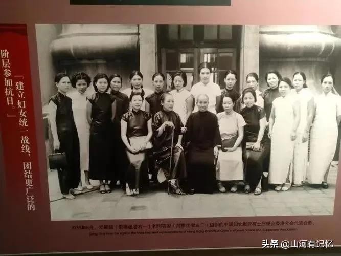 第一排坐者从左至右为:黄慕兰,何香凝,赵洪文国,朱光珍,邓颖超。